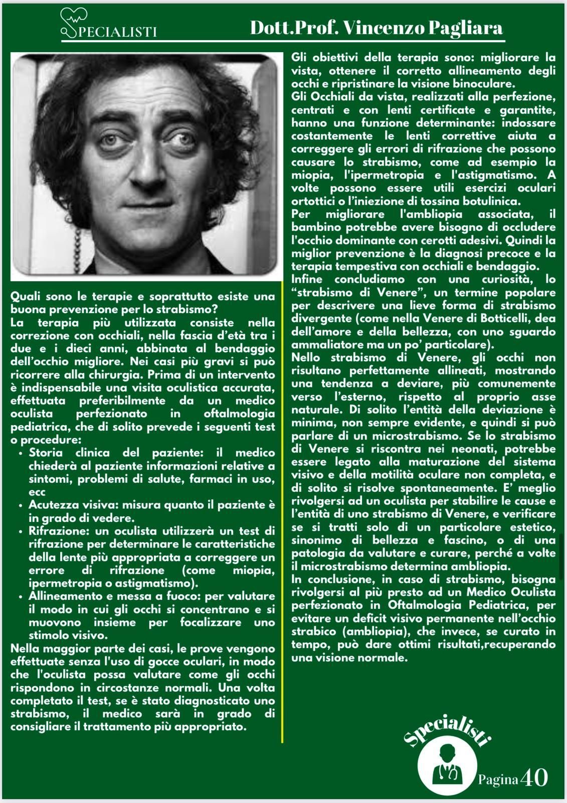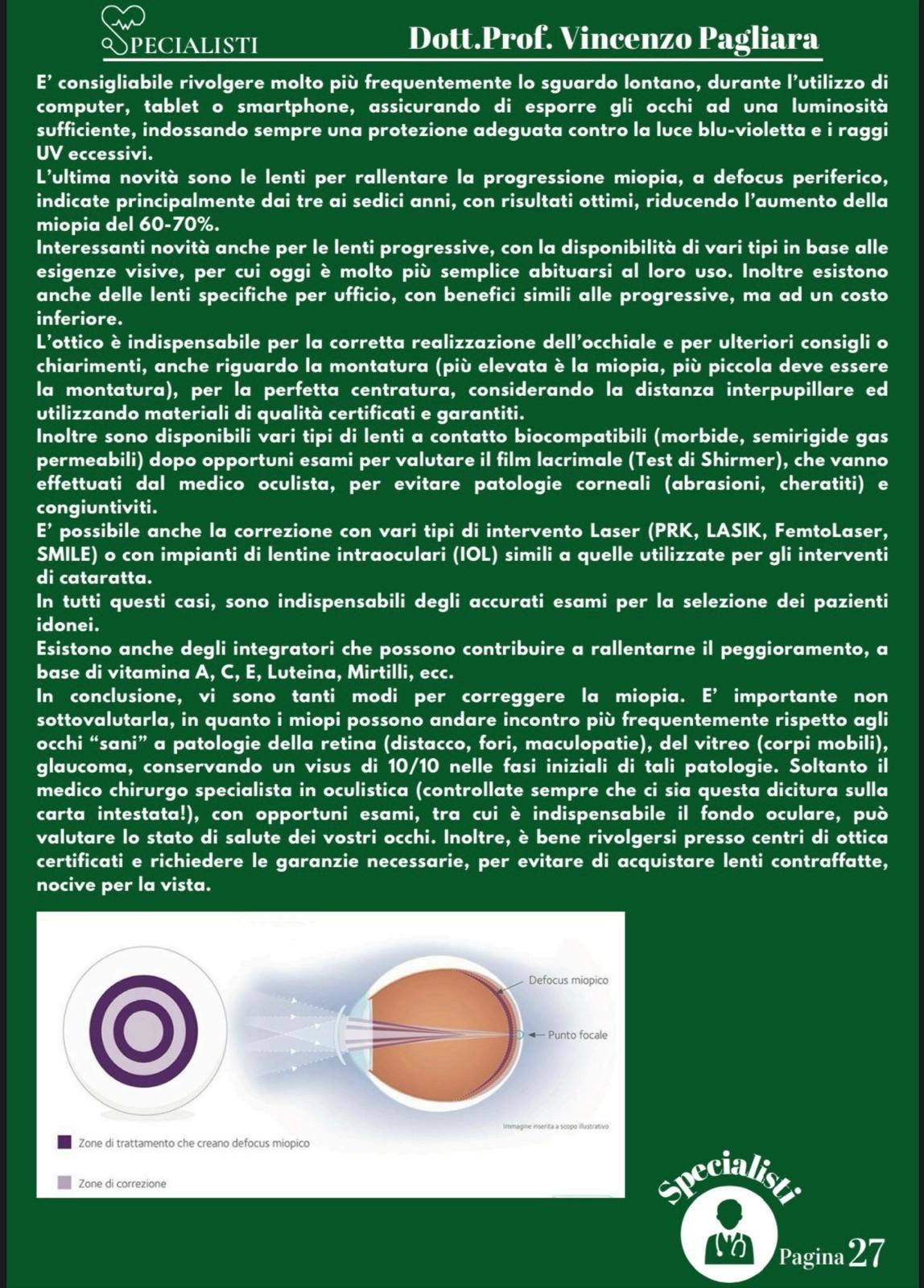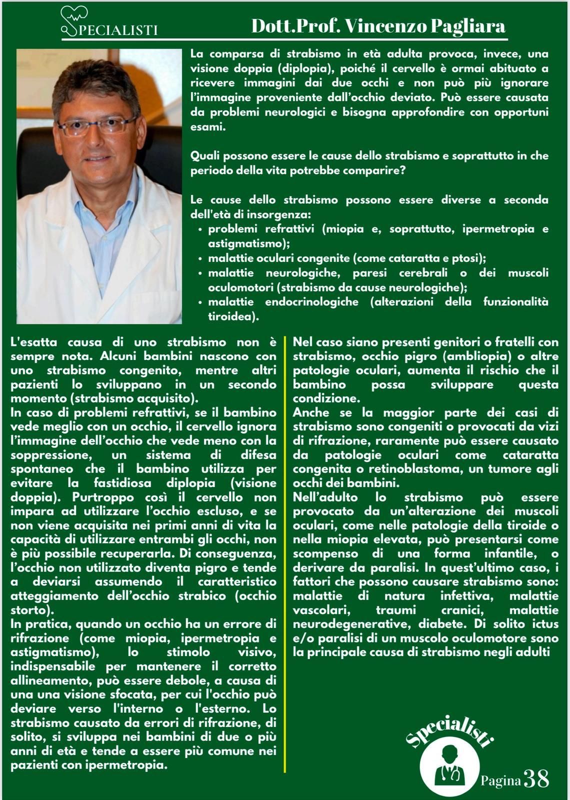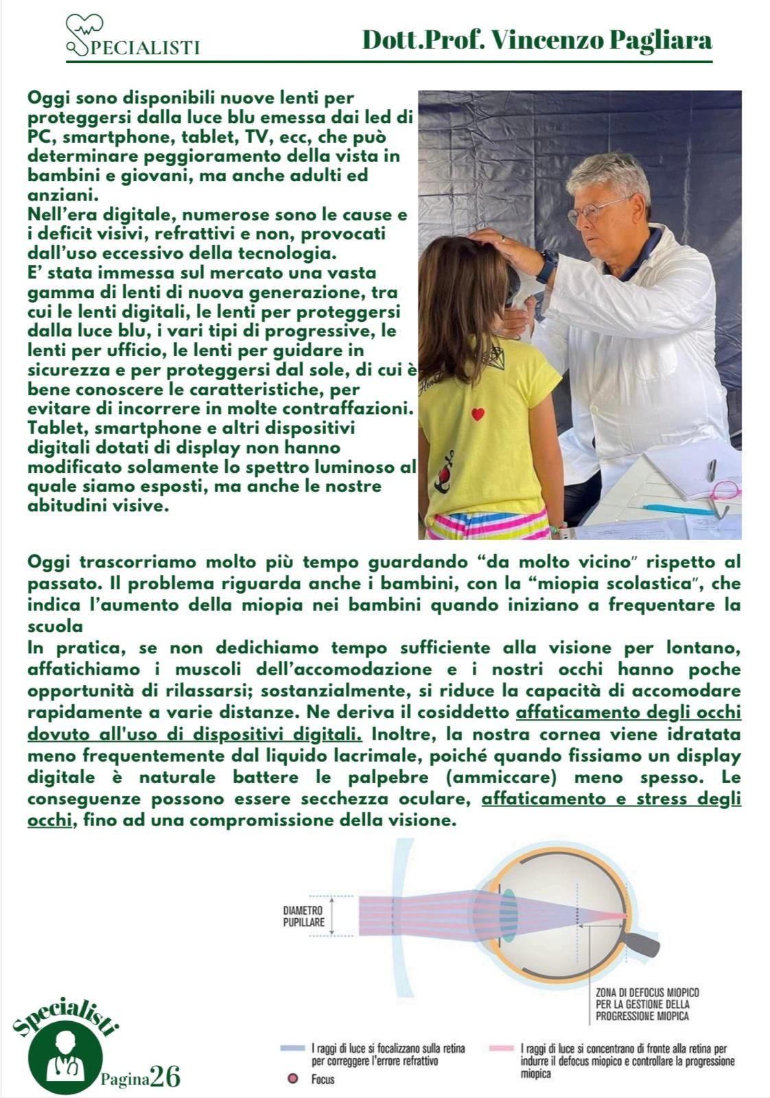 Il prof. Vincenzo Pagliara è un medico e chirurgo di fama a Salerno che da molti anni svolge visite oculistiche anche private presso il suo studio. Il dottore è specializzato in diagnostica oculistica attraverso l’uso di macchinari innovativi e di rigore scientifico che permettono di svolgere esami non solo accurati ma rapidi, per poter intervenire con le terapie più efficaci prima che la malattia possa degenerare in patologie più gravi.