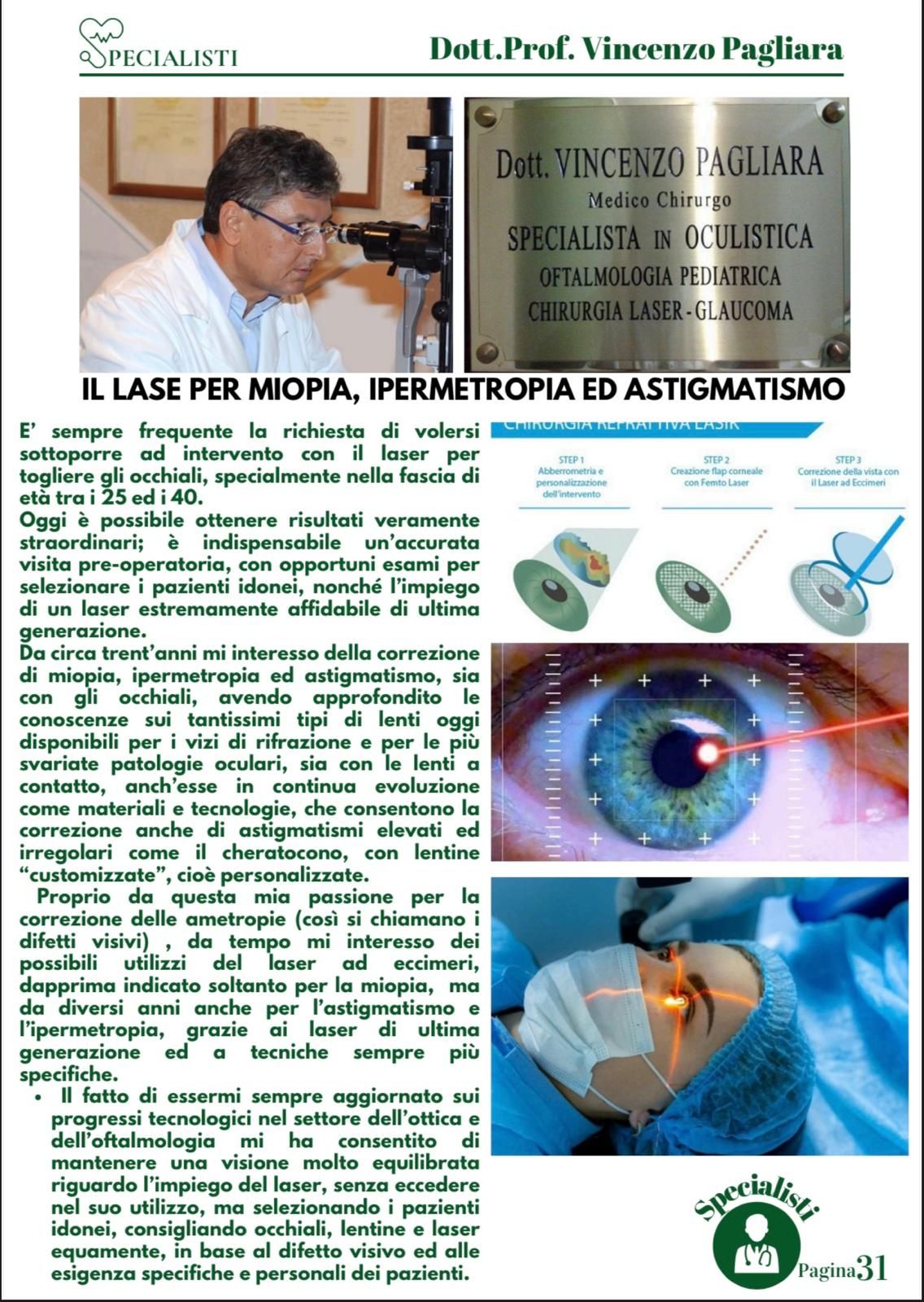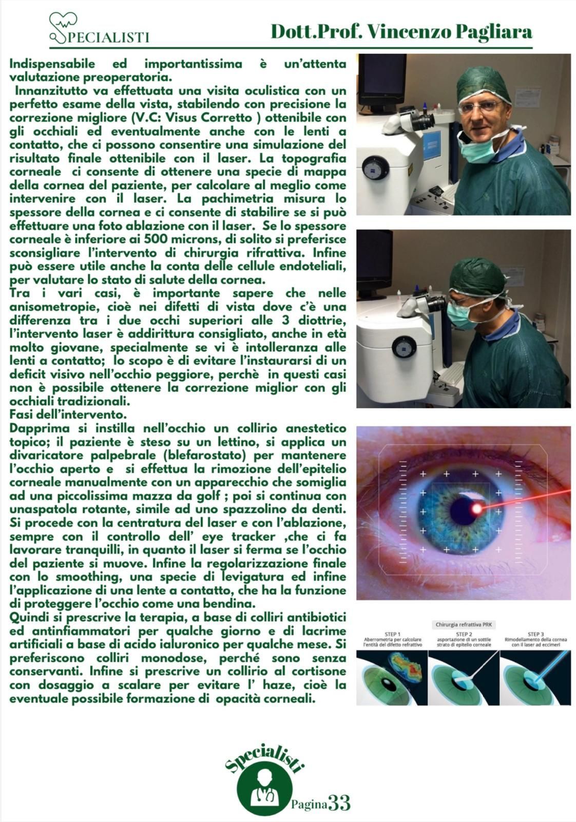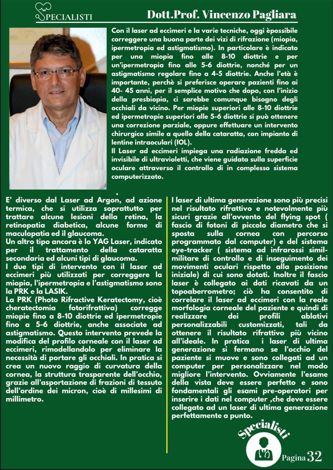 Durante i suoi anni di carriera, il Prof. Vincenzo Pagliara si è specializzato in differenti campi della medicina, dalla diagnostica oculistica oculistica alla microchirurgia con laser. Presso lo studio di diagnostica oculistica è possibile svolgere diagnosi precoci di cataratta per poter intervenire con microchirurgia non invasiva dai risultati sicuri e con brevi tempi di recupero. Inoltre il dottore è specializzato anche in diagnosi e cura del glaucoma, miopia e astigmatismo.